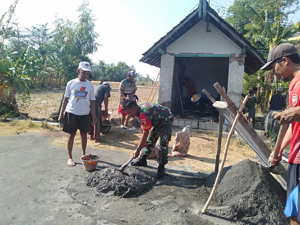 Budayakan Gotong Royong Babinsa Kodim Madiun Kerja Bakti Perbaiki Pos Sikamling