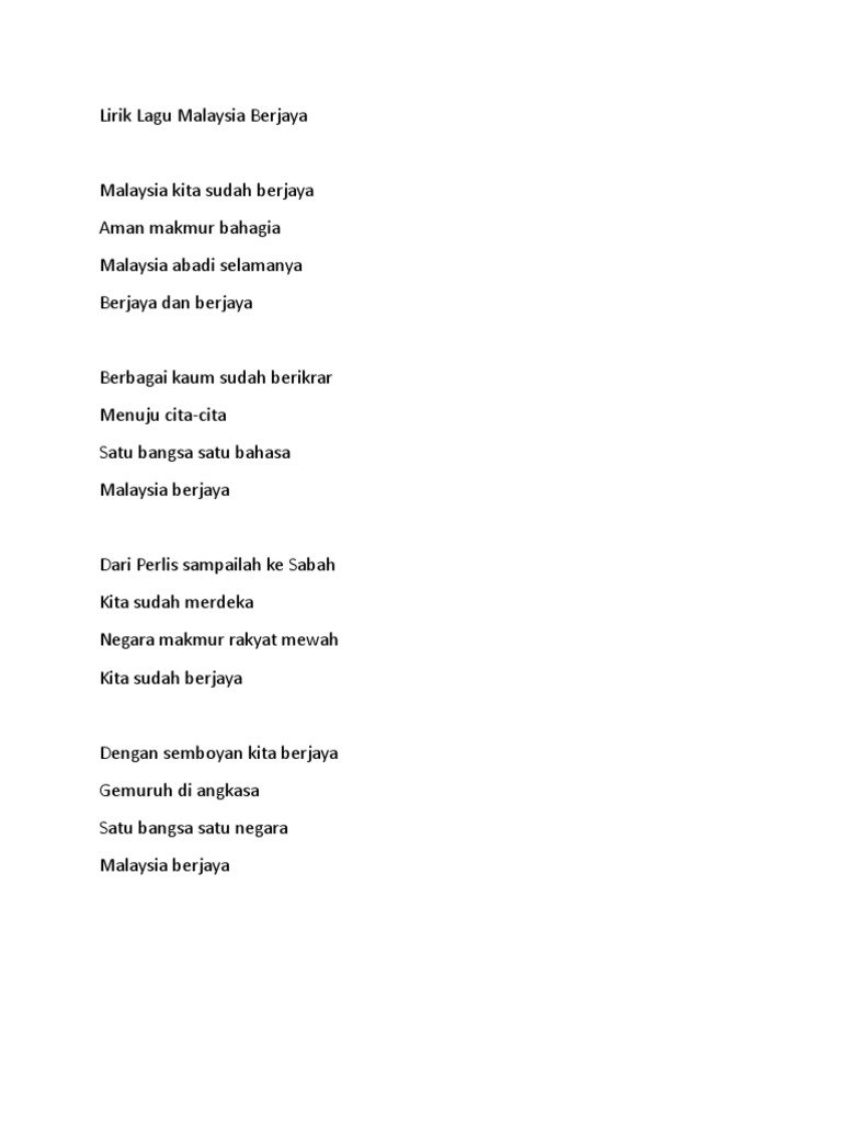 Enjoy lyrics of songs from. Malaysia kita sudah berjaya aman makmur bahagia malaysia abadi selamanya berjaya dan berjaya berbagai kaum sudah berikrar menuju cita cita satu bangsa satu negara malaysia berjaya dari perlis sampailah ke sabah kita sudah merdeka negara makmur rakyat mewah kita sudah berjaya dengan semboyan kita berjaya menuju di angkasa satu bangsa satu negara malaysia berjaya. Diunggah oleh izhar zaid. Berbagai kaum sudah berikrar menuju cita cita satu bangsa satu negara malaysia berjaya.