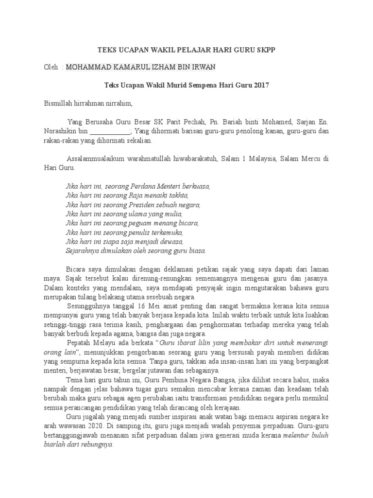 Mohammad Kamarul Izham Bin Irwan Teks Ucapan Wakil Pelajar Hari Guru Skpp